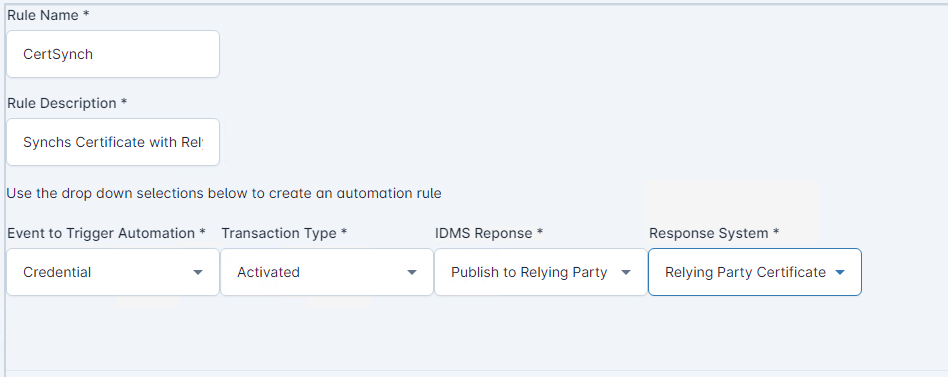 | 4 | Configure the following: Event to Trigger Automation: Select Credential Transaction Type: Select Activated IDMS Response, Select Publish to Relying Party Response System, Select the Relying Party System Name Press Create Rule | Final Automation Rule Example: ![]() |