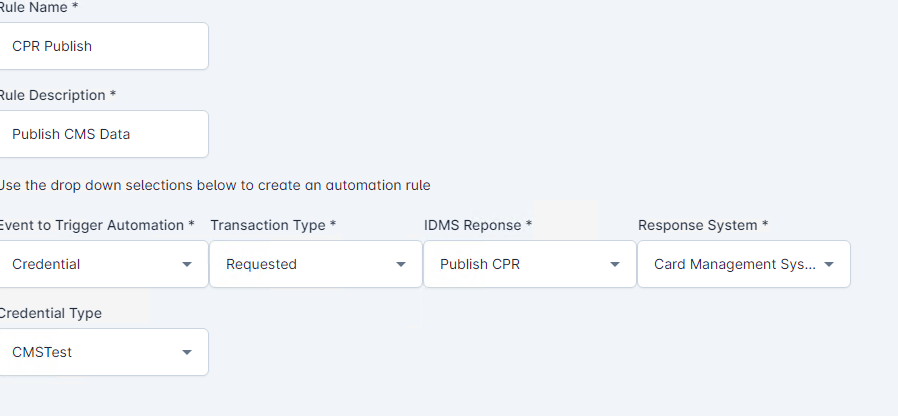 | 4 | Configure the following: Event to Trigger Automation: Select Credential Transaction Type: Select Requested IDMS Response, Select Publish CPR Response System, Select the Card Management System Name Select the Credential Type Press Create Rule | Final Automation Rule Example ![]() : |