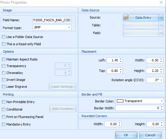 | 2 | Within the photo properties section, configure the following: Field Name: P2000_FASCN_BAR_CODE Format type: .BMP Width: .50 Height: 2.20 Rotation Angle 0 Maintain Aspect Ration : No check box. Border Color: Transparent Border Width: 0 |