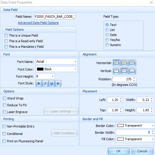 | 5 | Within the data field properties, configure the following: Field Name: P2000_FASCN_BAR_CODE_TEXT Font: Arial Font height:8 Rotation: 270 |
