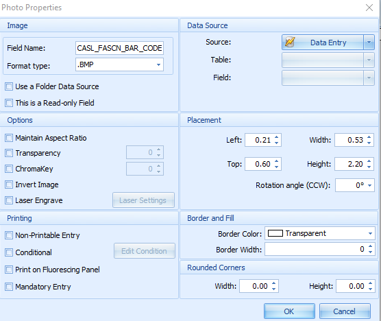 | 2 | Within the photo properties section, configure the following: Field Name: CASL_FASCN_BAR_CODE Format type: .BMP Width: .50 Height: 2.20 Rotation Angle 0 Maintain Aspect Ration : No check box. Border Color: Transparent Border Width: 0 |