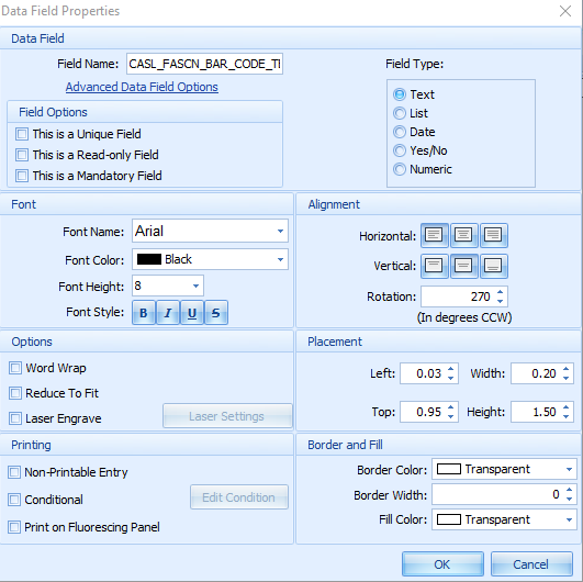 | 5 | Within the data field properties, configure the following: Field Name: CASL_FASCN_BAR_CODE_TEXT Font: Arial Font height:8 Rotation: 270 |