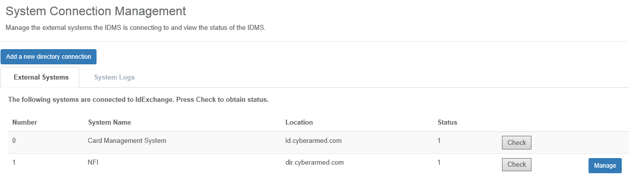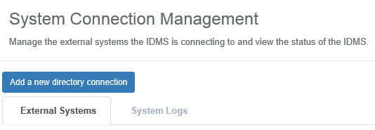 | 1 | Authenticate to the IDMS as a system administrator. Once logged in, go to the Administration, System Connections tab. |