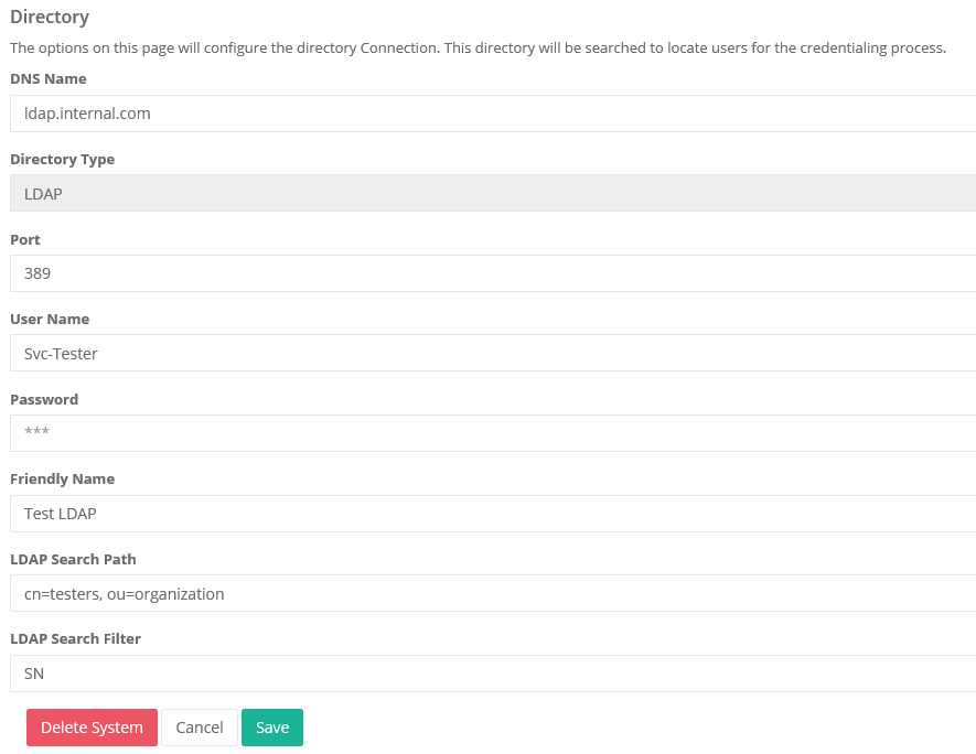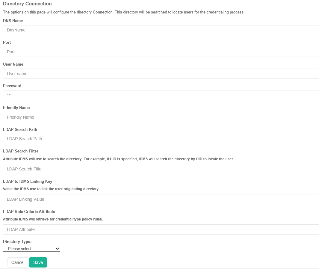 | 3 | Next, add the following information; DNS Name: This is the IP address of DNS of the active directory that contains the organization's users that will be credentialed. Port: This is the port number of the active directory. User Name: This is the user/service that can log into active directory and perform search queries. Password: This is the password of the user/service that will login and perform queries. Friendly Name: A name that will help describe the directory connection. LDAP Search Path: This is the location of where the users will be searched. LDAP Search Filter: This is the LDAP attribute the IDMS will use to search the directory. For example, if the SN (Last Name) is specified, the IDMS will search the directory by Last Name. LDAP To IDMS Linking Key: Once a user has been entered into the IDMS, the IDMS will search its internal database to locate the user. The LDAP to IDMS Linking key sets the attribute from the directory the IDMS should use to link the identity. For example, if UID is the linking key, the IDMS will locate the user by UID. Sample LDAP to IDMS Linking Key: RedHat Directory: UID ActiveDirectory: samAccountName LDAP Rule Criteria: This value is used when the IDMS needs to retrieve data from the directory for rule validation LDAP Attribute(s) To Be Validated: This configuration allows the operator to specify additional LDAP Attributes to be retrieved from the directory which can then be used for further validation or to assist the operator select the correct applicant for processing.
