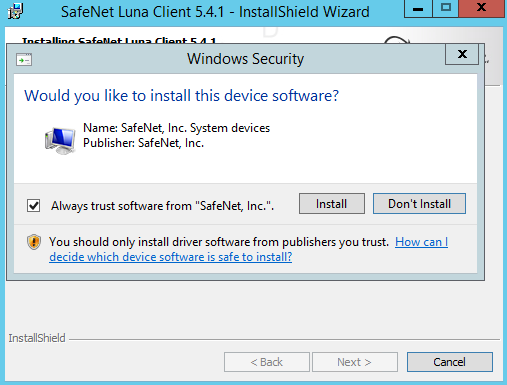 | 9 | Select Install when asking to install the SafeNet System Devices. |