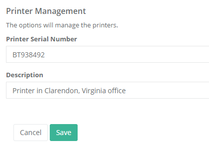 | 4 | Enter the serial number from the printer and a brief description and press Save. |